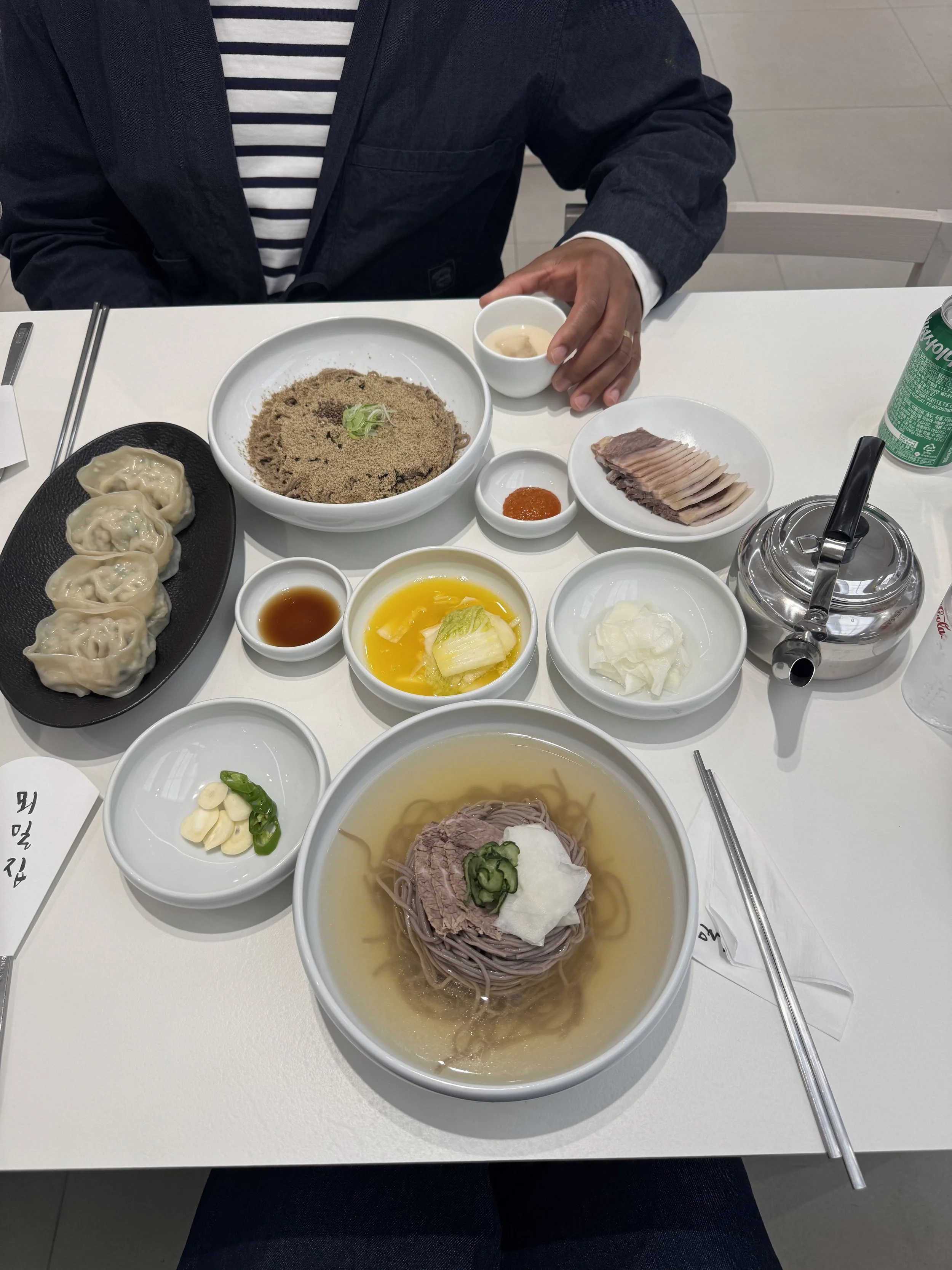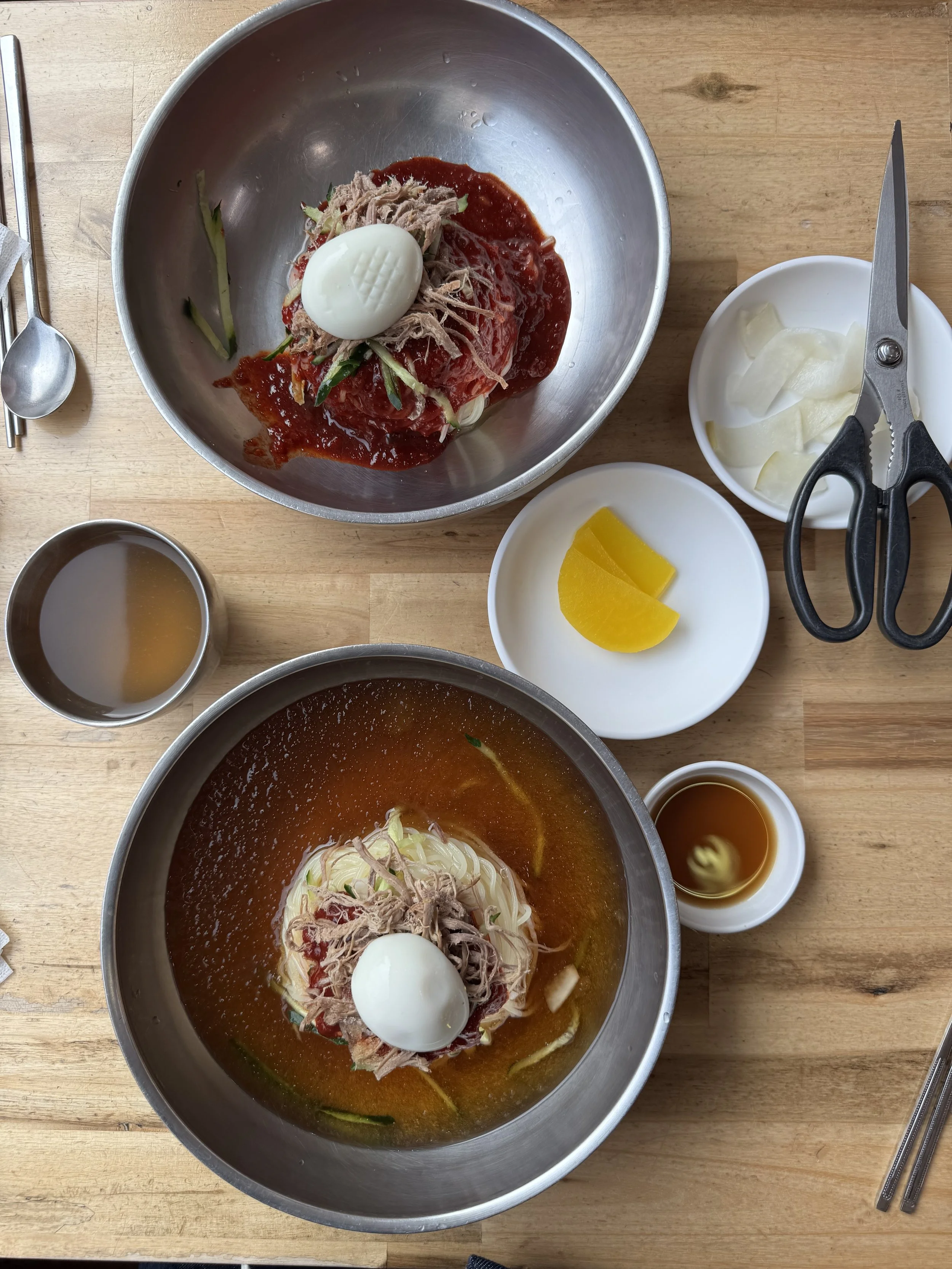 We ordered the spicy bibim (mixed) milmyeon and the one in an icy pork broth (my favorite), along with some beautiful steamed mandu dumplings. The noodles were fantastic and had a specific, special chewy texture that Koreans seem to love—different from an al dente Italian-style pasta. They have a payment kiosk at each table where you prepay for your meal, and they bring it out quickly. They provide hot broth and water to drink, and everything is self-serve. This was one of my favorite meals from this trip.