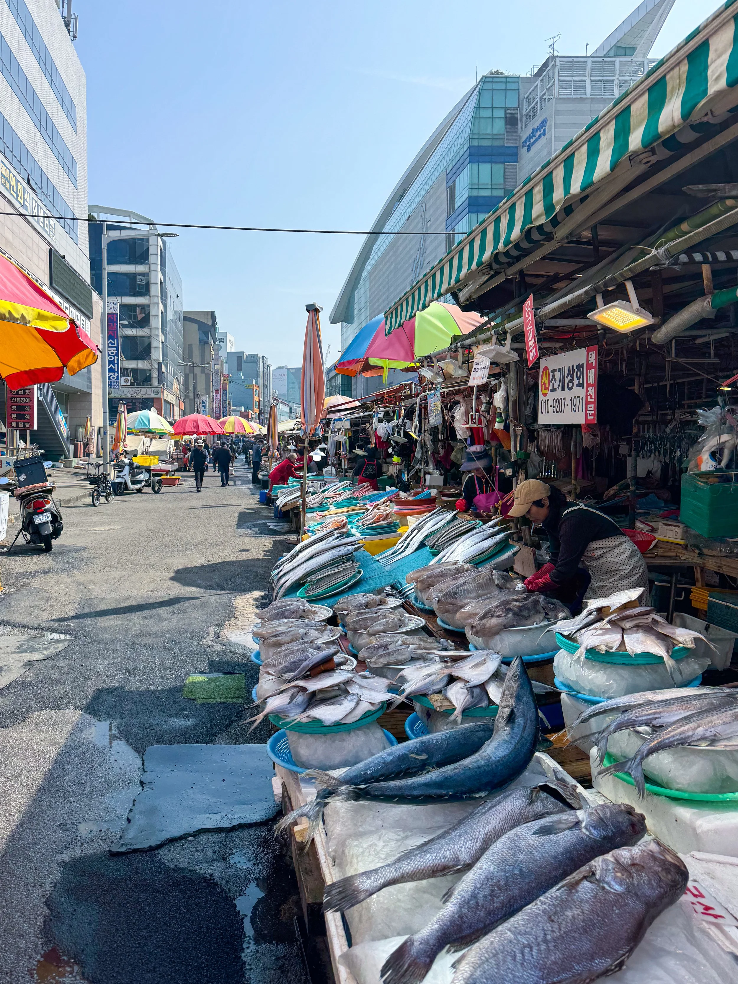 Romaine and I took a train down to Busan from Seoul at the end of March. I’d heard great things about this city, and I love a port city. Busan is a true food town; there is a rich culinary tradition due to its coastal location and history. During the Korean War, Busan was one of two cities in South Korea that remained free and welcomed refugees from various regions. Busan is also known for its seafood, BBQ, and spicy food. The air smells of the sea and grilled meats, and I loved wandering around with Romaine as the cherry blossoms began blooming.