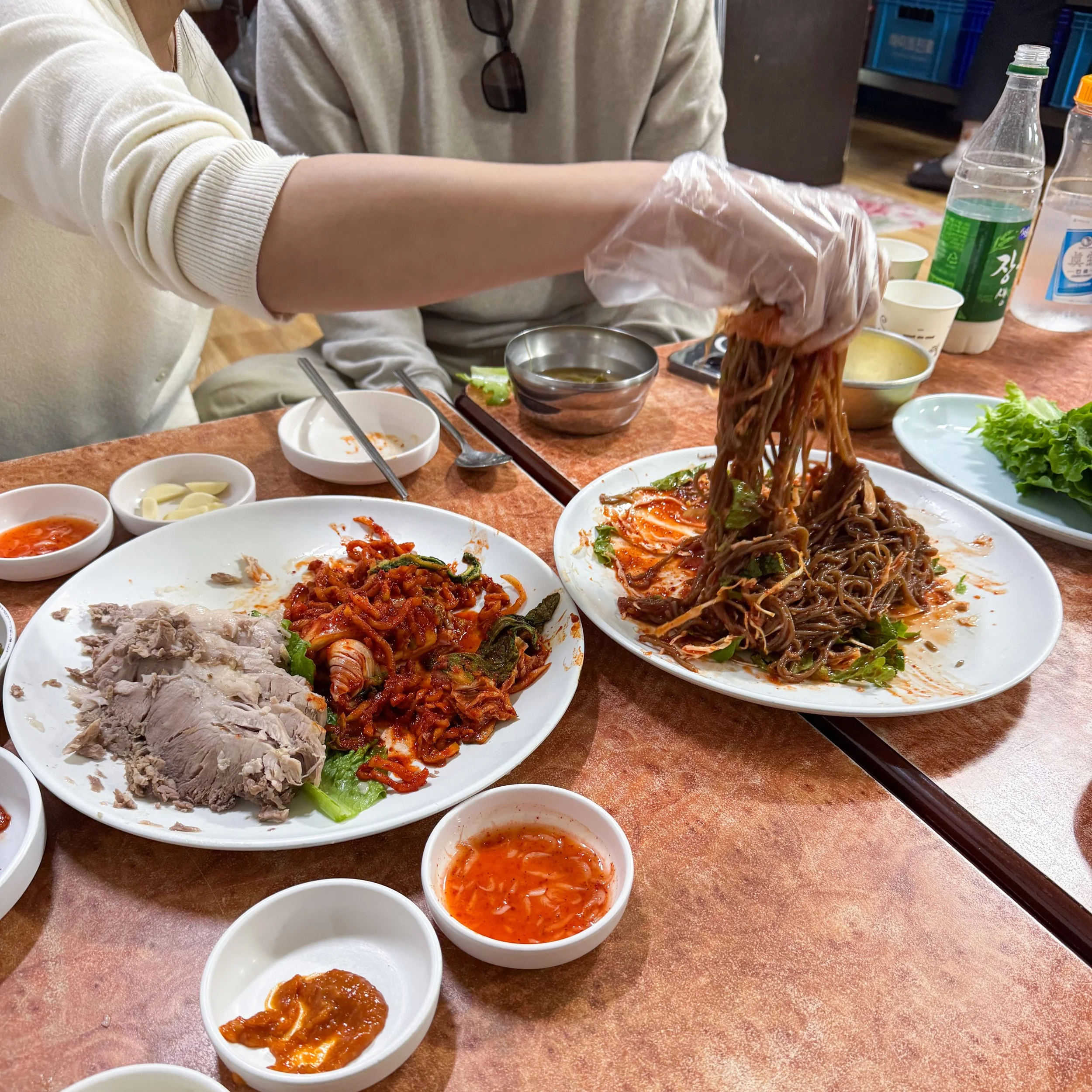 After a long flight, Romaine and I landed in Seoul in the early evening. Our friends from our Paris days, Hangyeol and Kyejung, picked us up from the airport. After a lovely reunion, they drove us to their Airbnb where they graciously hosted us. We dropped off our luggage, toured their gorgeous pastry shop 데시데 pâtisserie décidé, and then went straight to dinner. Our first meal was bossam: succulent, tender, boiled pork served with ssam, geotjeori (fresh unfermented kimchi), and chewy spicy buckwheat noodles that you mix with a gloved hand. This was a delightful first meal back in Korea, and one I find myself thinking about regularly.
